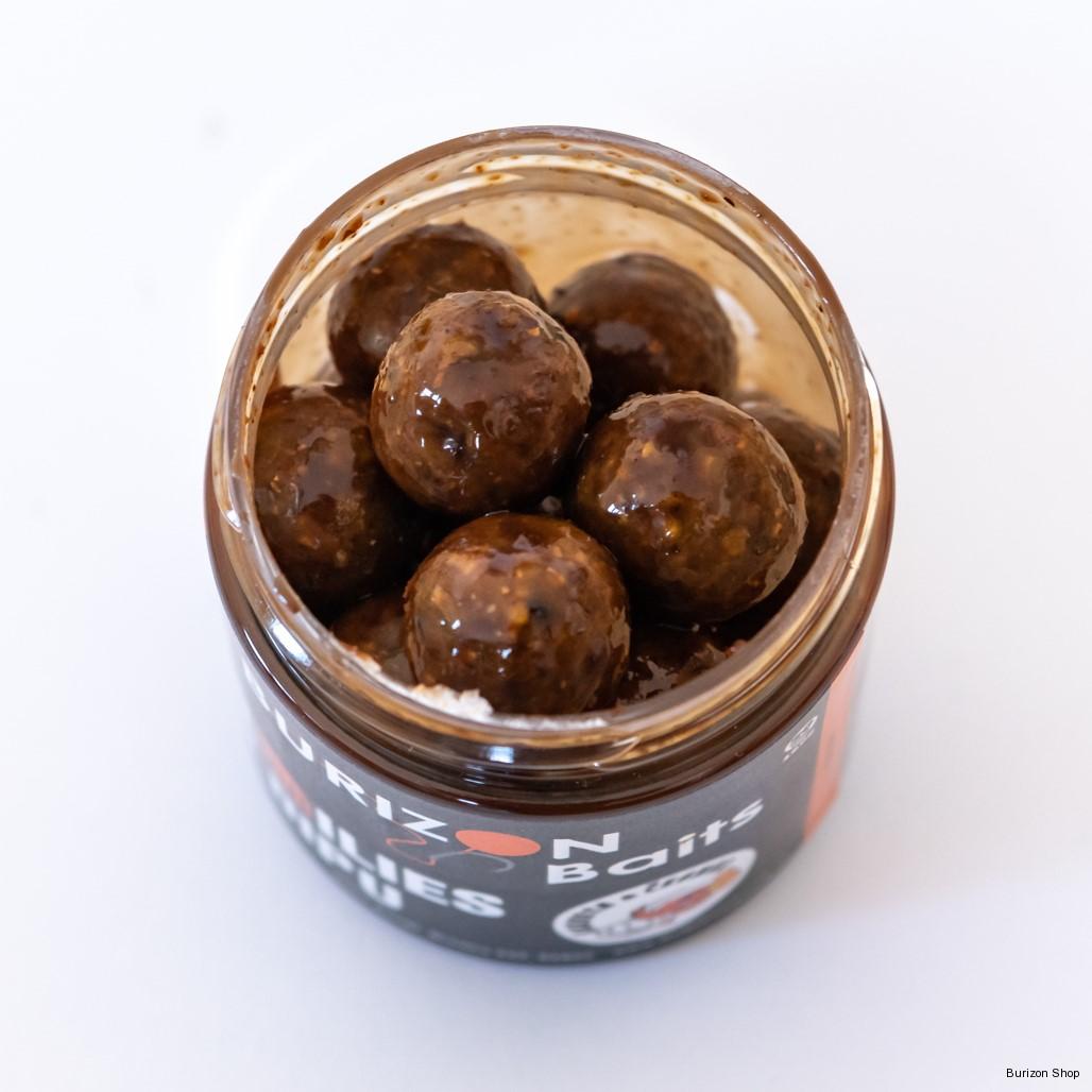 Zajímavá a přesto účinná kombinace. Krevetí maso obsahuje velmi vysoký podíl bílkovin, vitamínu B2, D, zinek, jód a vápník. Na základě těchto nutričních hodnot, jsme se rozhodli vytvořit boilies na které budou ryby velmi dobře reagovat a hlavně bude nutričně bohaté pro jejich vitalitu. Kombinace masové nasládlé chuti krevetí moučky a rybí předtrávené moučky je zkrátka to, co mají ryby rádi. Do boilies jsme přidali menší množství sušeného česneku tak, aby bylo boilies použitelné celoročně a nikoliv jen na jaře. Dále obsahuje proteiny a kvalitní zahraniční esence. Boilies na konci procesu ještě máčíme v esenci a pomalu sušíme. Esence je vtáhnutá až do samého jádra boilies, proto boilies funguje až do doby, než se rozpadně. Rozpad zpravidla bývá do 24 hodin v teplé vodě. Boilies obsahuje kvalitní konzervant. Boilies je bez umělých barviv s vysokou nutriční hodnotou, která zaručuje velmi dobrou stravitelnost u ryb.